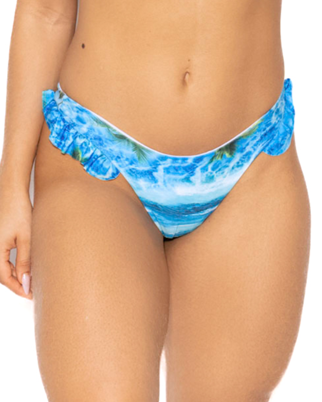 Uma característica única desta calcinha é o fio duplo na parte de trás, que permite conquistar uma marquinha de sol deslumbrante. As laterais apresentam tiras finas com um charmoso babadinho, além de um elegante pingente na frente, que adicionam um toque extra de beleza à peça.